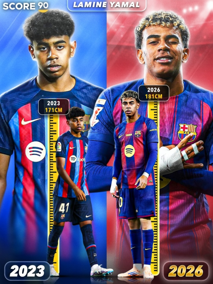 知名足球媒体Score90近日发布图文,展示了巴塞罗那新星亚马尔自2023年至2026年的身体发育变化。