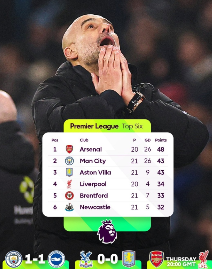 01月08日讯 英超第21轮两场焦点战落幕,曼城主场1-1战平布莱顿,阿斯顿维拉客场0-0与水晶宫握手言和。双方同积43分,继续分列积分榜第二、三位。