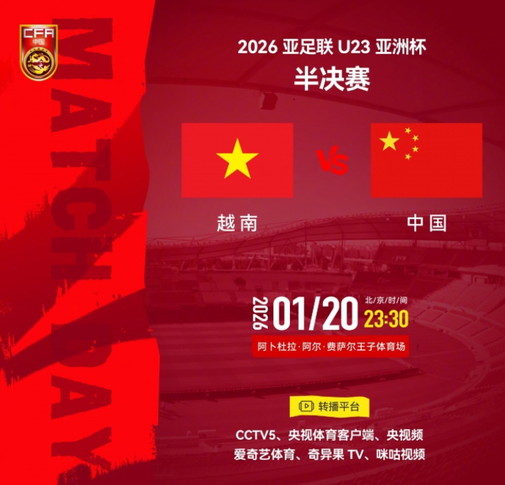 北京时间今晚23:30,U23亚洲杯半决赛,中国男足U23将对阵越南U23。