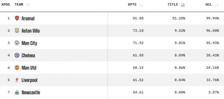 Opta英超夺冠概率:阿森纳81%居首 维拉压力曼城
