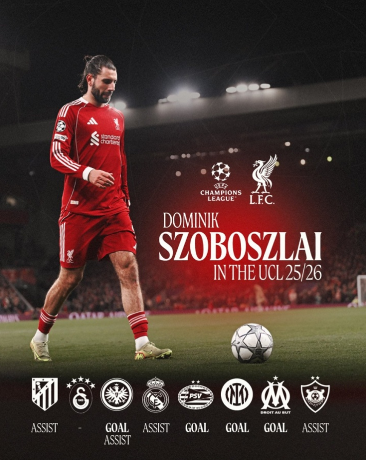 利物浦官方社媒晒出索博斯洛伊本赛季欧冠的数据,8场欧冠比赛,其中7场他参与进球,总计打进4球助攻4次。