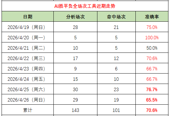 胜平负工具:累计预测143场,命中101场,准确率高达70.6%,其中仅1天准确率低于65%,连续5天准确率保持在65%及以上,这份建立在超百场赛事基础上的成绩,绝非偶然。