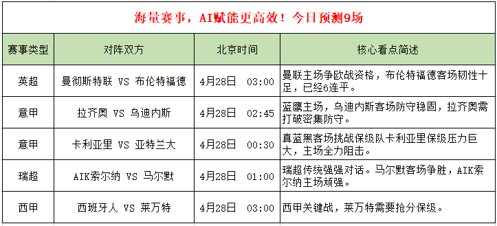 4月27日竞彩赛事火热开启,今日共9场焦点对决横跨英超、意甲、瑞典超等多大赛事,曼联、拉齐奥、亚特兰大等一众知名球队悉数登场。AI大数据预测全程覆盖所有场次,用多维度数据模型拆解每一场赛事的胜负关键,为你带来专业、精准的赛事参考。点击查看今日AI预测